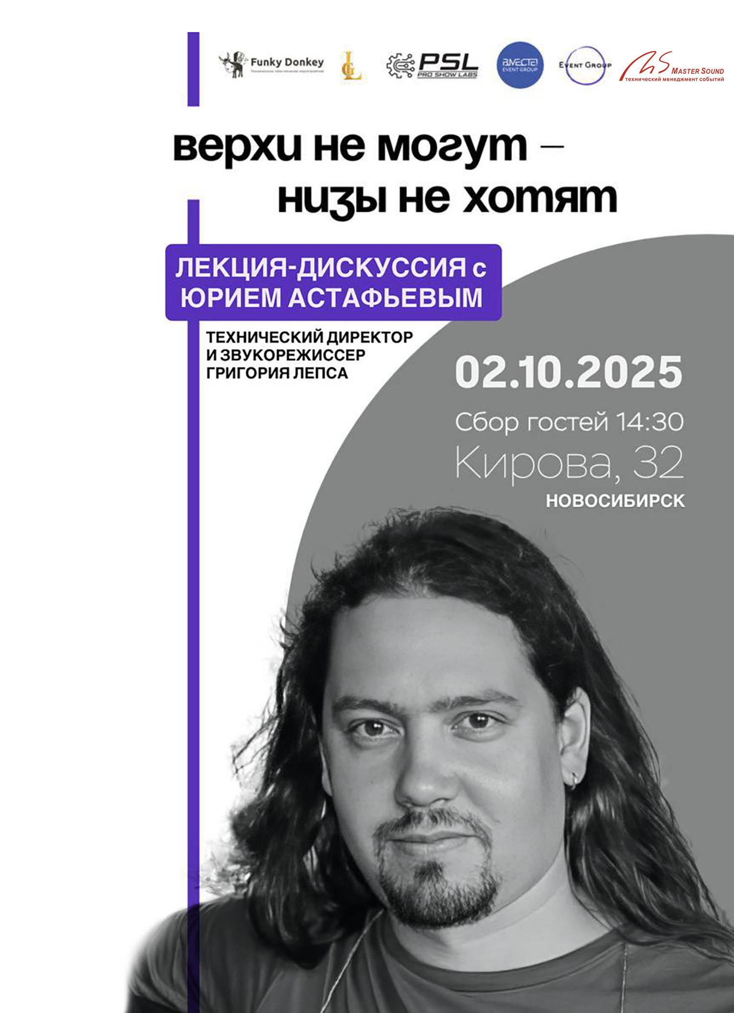 ![]() | Если ты технический специалист, event-организатор или просто работник культуры, то это предложение для тебя! Мы приглашаем тебя на лекцию-дискуссию с техническим директором Григория Лепса. «Верхи не могут-низы не хотят» Юрий Астафьев – технический директор и звукорежиссер певца Григория Лепса, организатор Конференции прокатчиков в Самаре, разработчик и основатель компании по проектированию и производству оборудования для шоу-программ Pro Show Labs, владелец прокатной организации. Юрий расскажет и поделится своим 25-ти летним опытом в таких вопросах: • Процесс организации технического сопровождения в работе с музыкальными коллективами и продакшн мероприятий ивент характера. • Корректное составление райдеров и ТЗ. • Взаимодействие служб, нахождение общего языка, работа на результат. • Разбор практических случаев с позиции более чем 25 летнего опыта. Встреча будет проходить по адресу: г. Новосибирск, ул. Кирова, 32, в конференц-зале агентства «Вместе» ВМЕСТЕ Event group 2 октября 2025 г. Сбор гостей с 14:30. В 15:00 старт мероприятия. Мероприятие организовано при поддержке: |